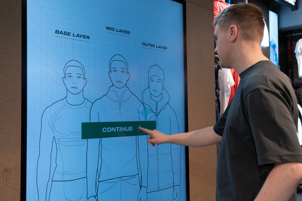 75” touch-enabled “Digital Mannequins” let customers explore a range of outdoor outfits tailored to different climates. Integrated Sound Shower technology creates immersive audio environments, playing ambient sounds like rain storms to help visualise gear in action. This sensory storytelling builds brand connection and supports longer, more meaningful interactions in-store.