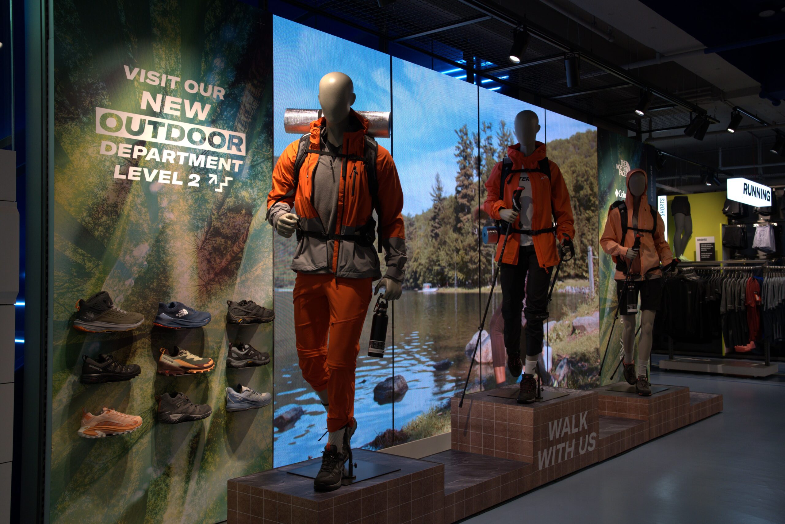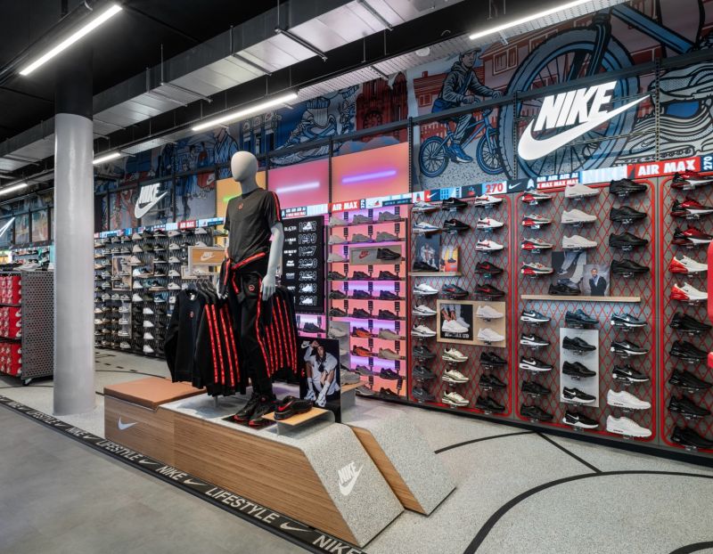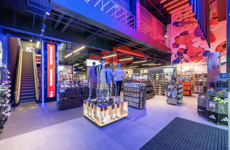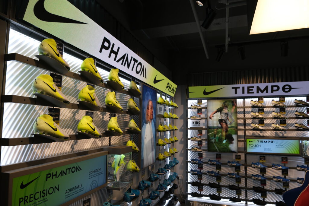 Feature displays highlight seasonal campaigns, while touchpoints like shoe finders and digital mannequins enhance product discovery.