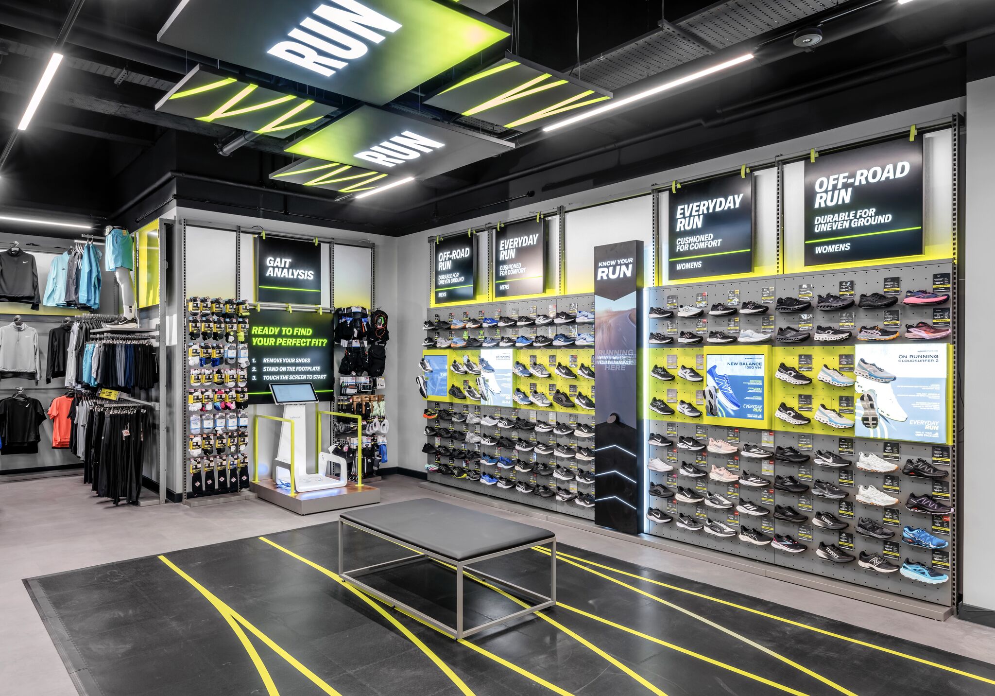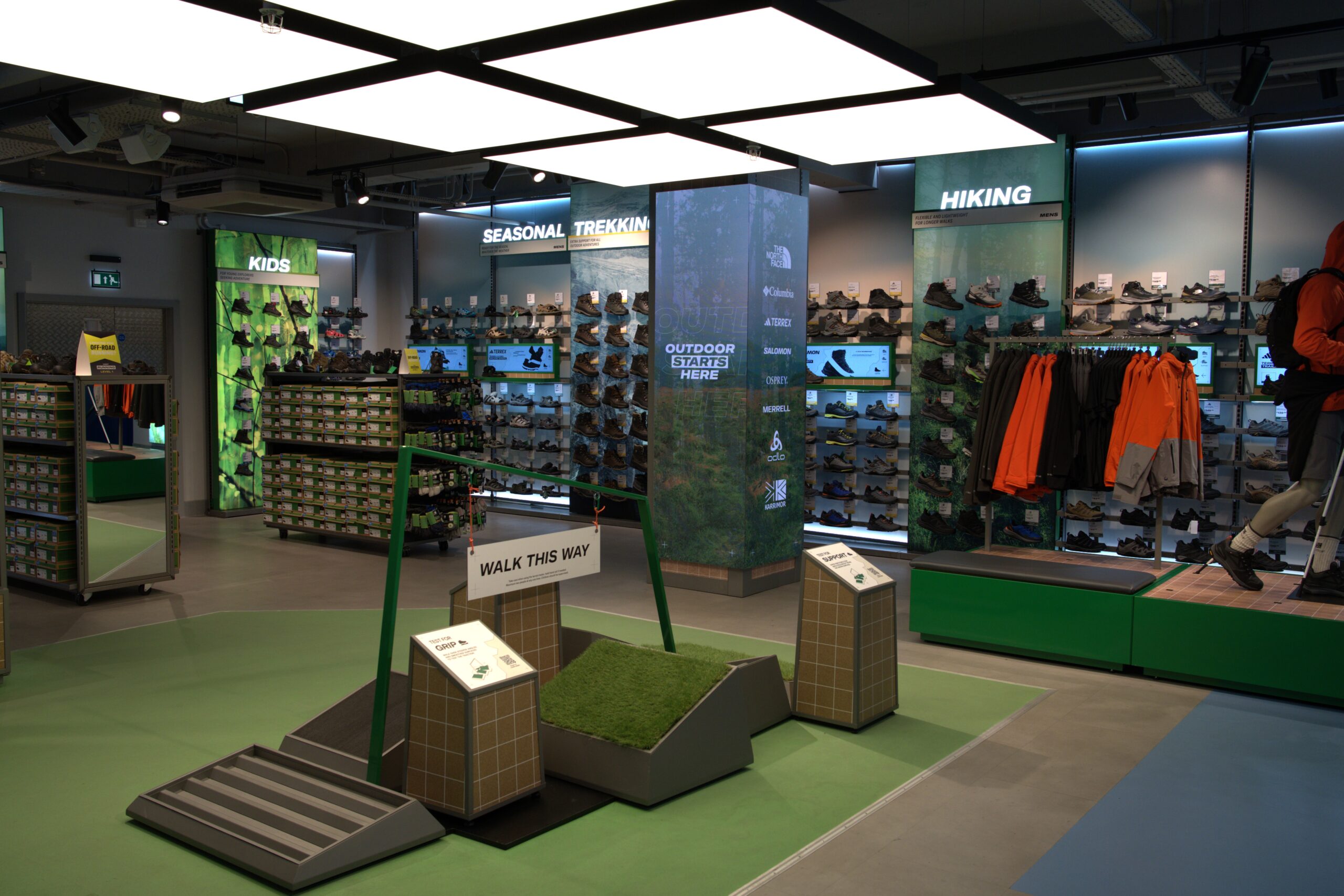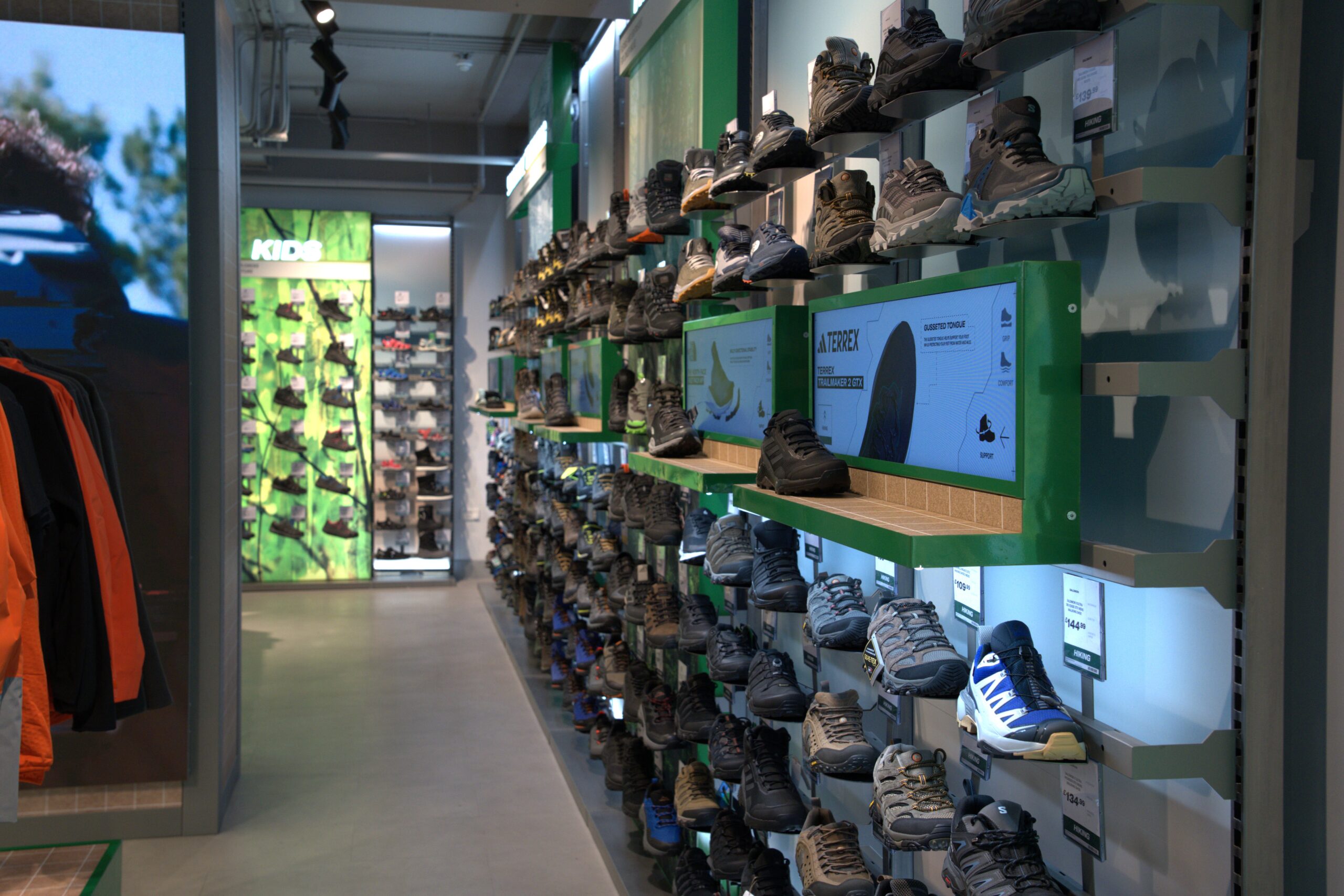 Feature displays highlight seasonal campaigns, while touchpoints like shoe finders and digital mannequins enhance product discovery.